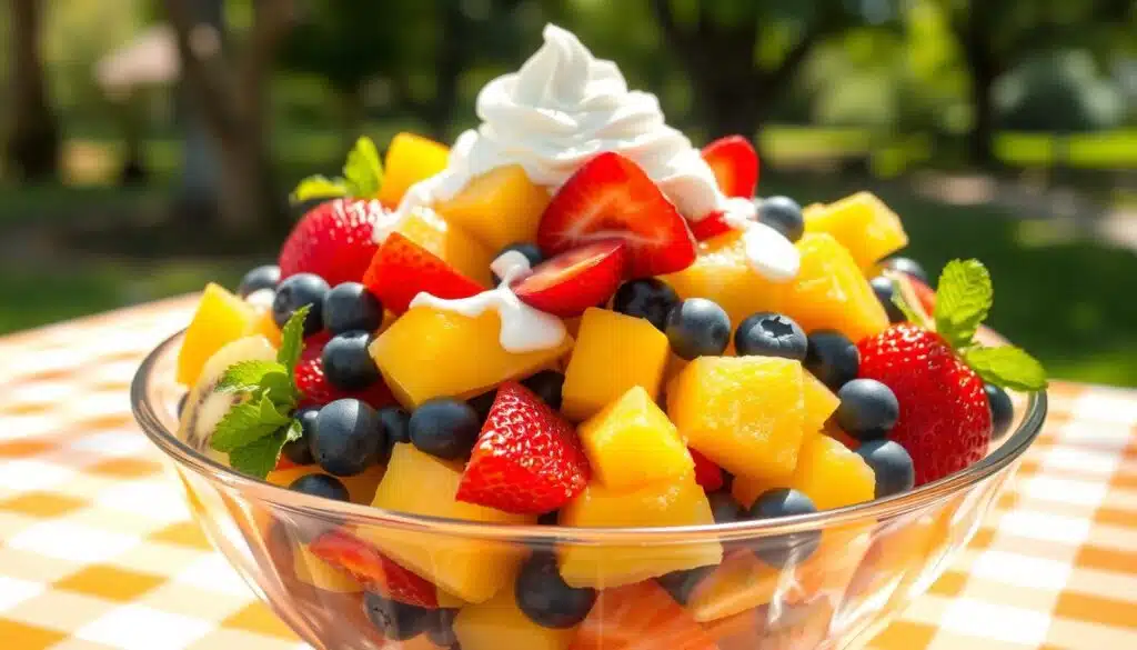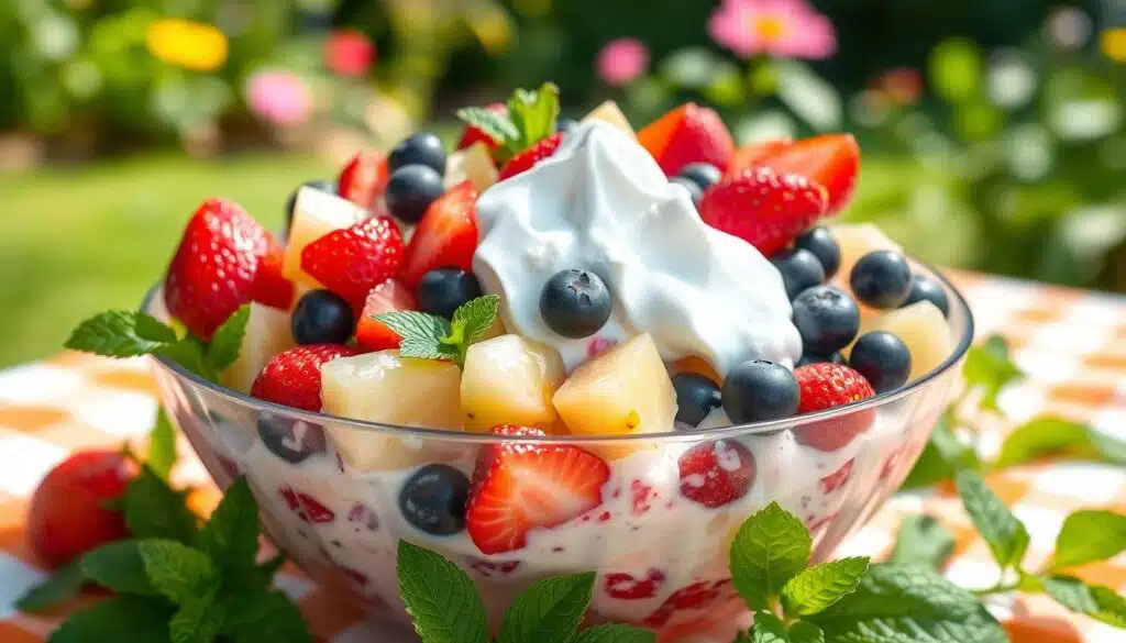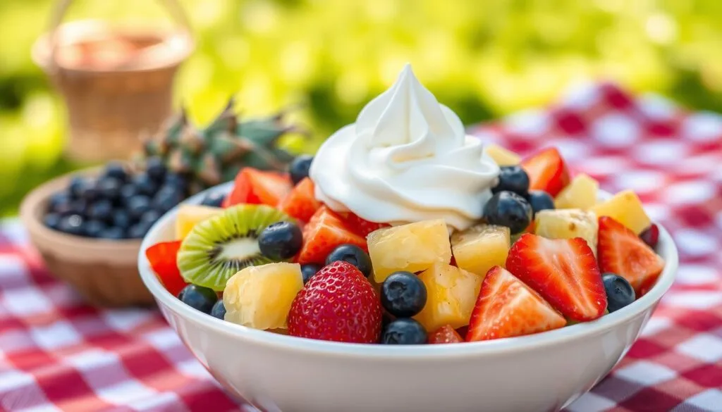 The fruit salad with cool whip is a hit for summer events. It’s easy to make and always a crowd-pleaser. By picking the right fruits and adding cool whip, you get a refreshing Fruit Medley that everyone will love.